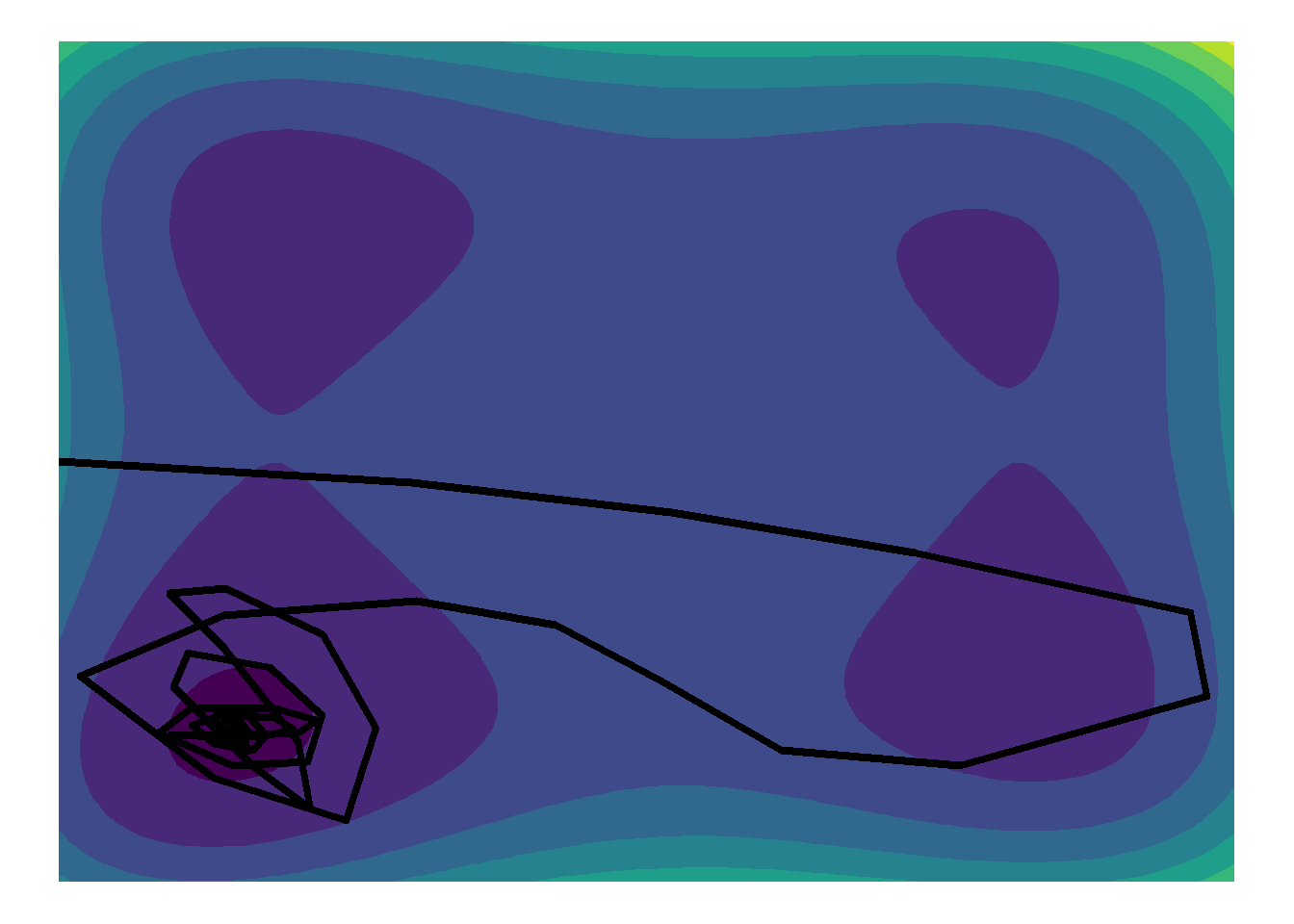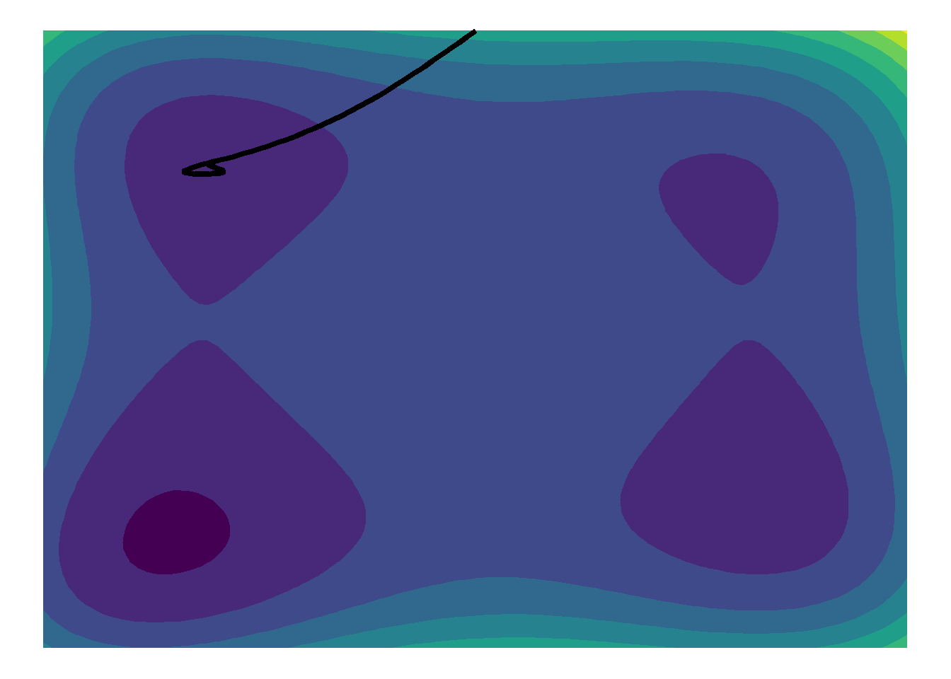 Pela Figura acima, nota-se que adicionando o componente de momento ao algoritmo de gradiente descendente, os passos da função de tornam muito mais erráticos, permitindo que a função passeie pelo espaço paramétrico por mais tempo, e impedindo o gradiente de descer nos primeiros vales que percorre. É possível observar que a função passou por todos os quatro vales de mínimos, até convergir em um dos mínimos locais.