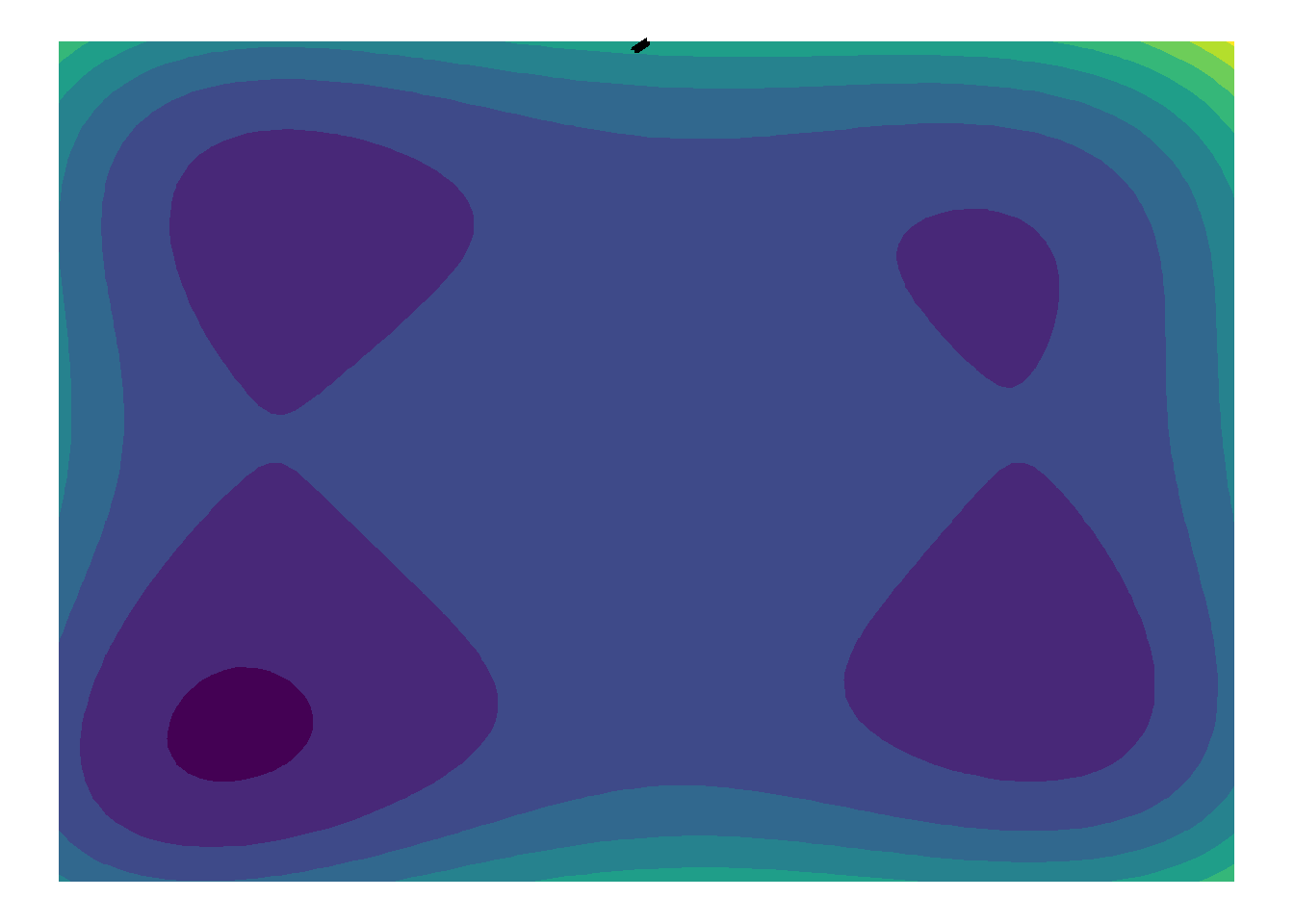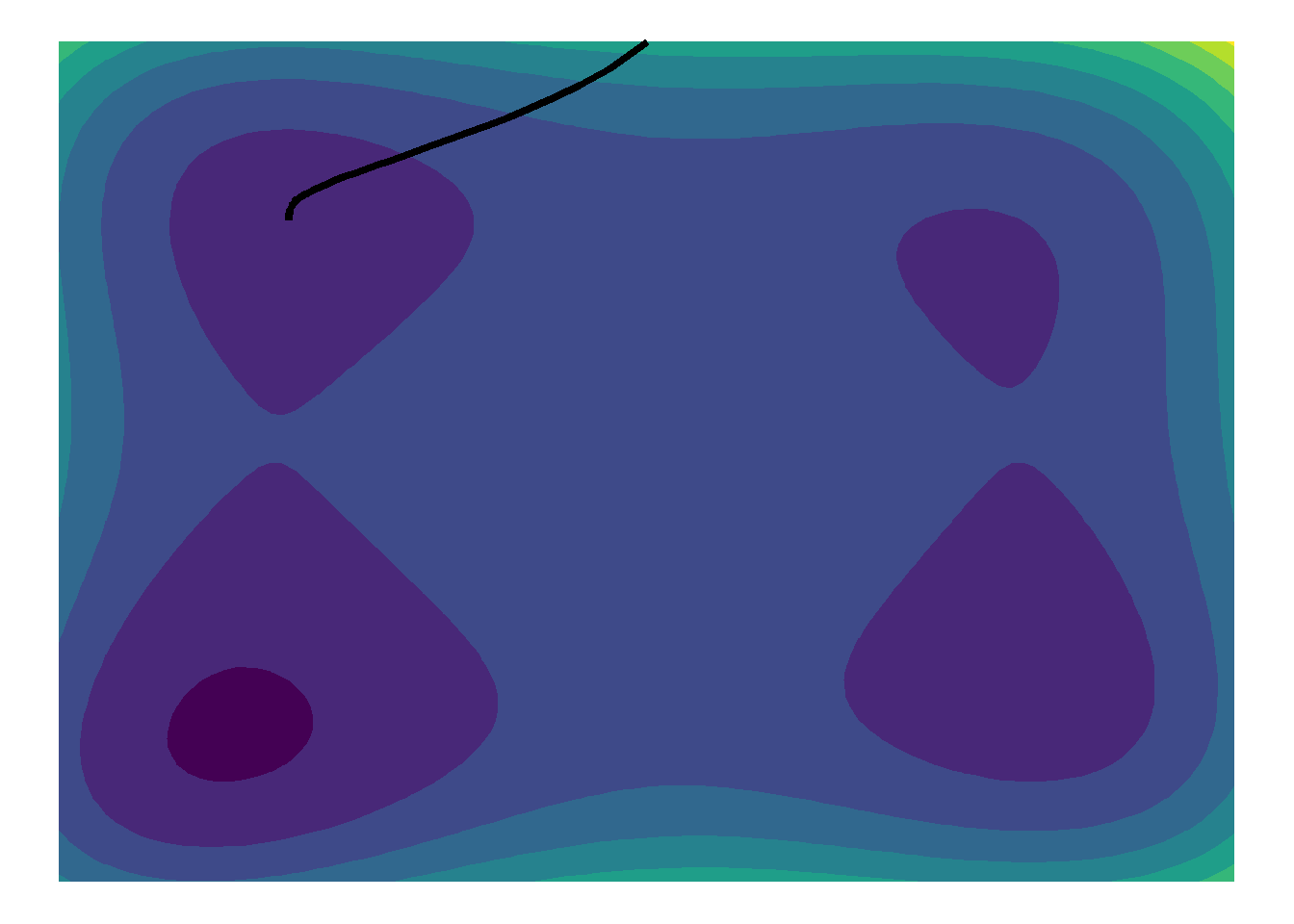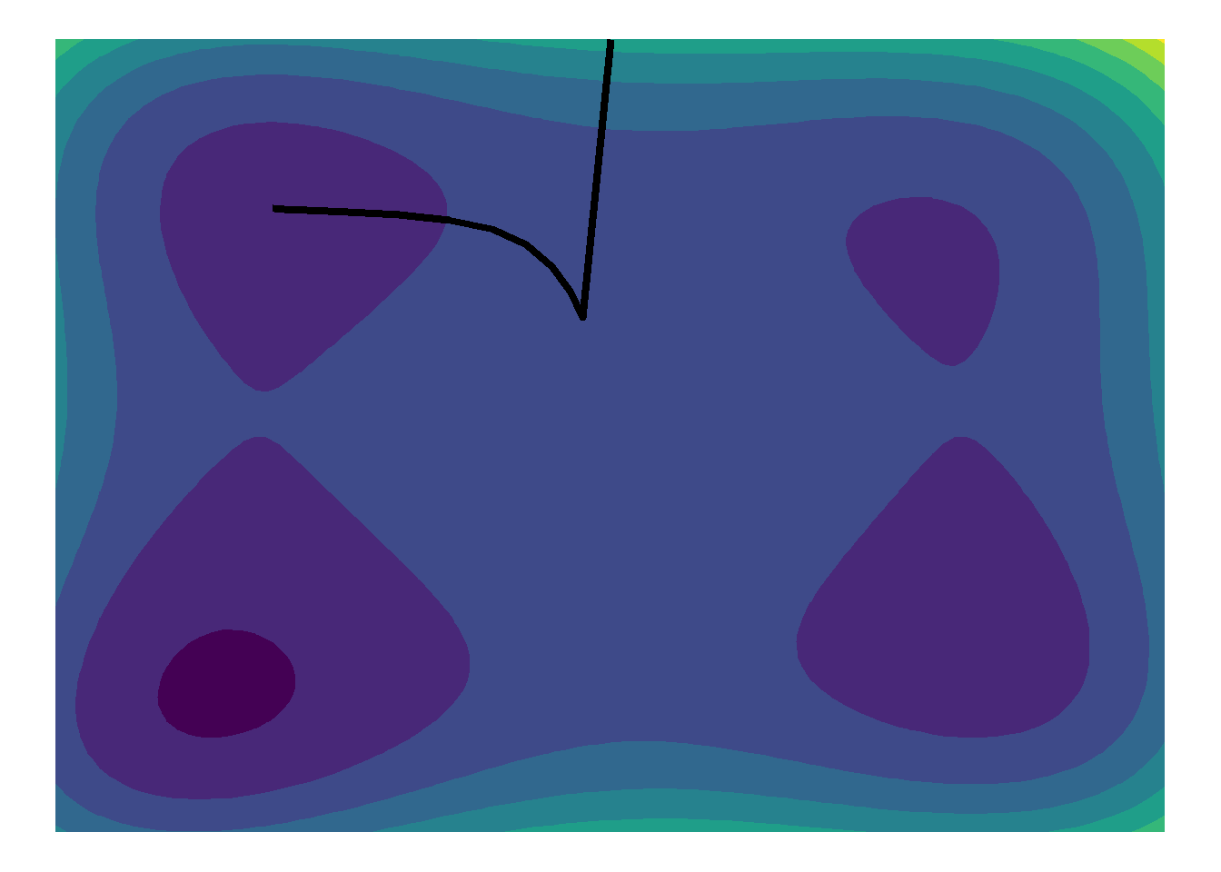 Observando o gráfico de contorno, considerando valores \(-5 < x_1,x_2 < 5\), a função aparenta ter diversos valores críticos, sendo três mínimos locais, um mínimo global — próximo do valor \(x_1 = -3.5, x_2 = -3.2\) —, além de diversos pontos de sela entre os mínimos locais e global.