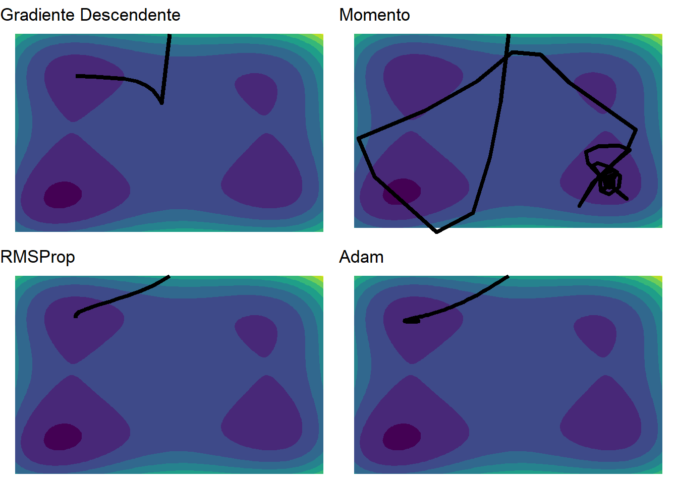 Pela Figura acima, nota-se que todos os algoritmos são eficazes em encontrar um ponto de mínimo, ainda que local. Nenhum deles conseguiu eliminar a necessidade de um bom ponto inicial para encontrar o mínimo global da função. Entretanto, como discutido em sala, não faz parte do paradigma de redes neurais artificiais no estado da arte atual a necessidade do mínimo global da função. Desta forma, estaremos mais preocupados com algoritmos que funcionem bem, e funcionem rápido, na busca pela convergência em algum ponto de mínimo aceitável. Neste sentido, todos foram eficientes, entretanto é possível notar que o gradiente na forma elementar pode ter problemas com pontos de sela e mínimos ruins, enquanto o método do momento pode ser muito errádico. Os métodos RMSProp e Adam aparentam ser mais estáveis, de rápida convergência para um mínimo aceitável e caminhar pouco errático.