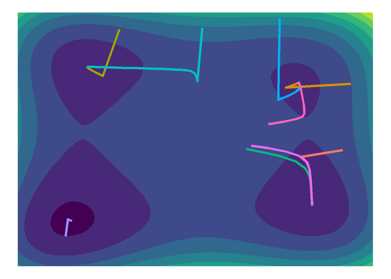 set.seed(42)pontos <-runif(20, -5, 5)trajetorias <-list()for (i in1:10) { resultado <-gradiente(learning_rate =0.01, n_steps =100, x1 = pontos[i], x2 = pontos[i+10])[[2]] trajetorias[[i]] <- resultado}traj_all <-do.call(rbind, Map(function(df, id) { df$traj_id <- id df}, trajetorias, seq_along(trajetorias)))ggplot() +geom_contour_filled(data = grid, aes(x = x1, y = x2, z = fx)) +geom_path(data = traj_all, aes(x = x1, y = x2, group = traj_id, color =as.factor(traj_id)), linewidth =1.5) +theme_void() +theme(legend.position="none")