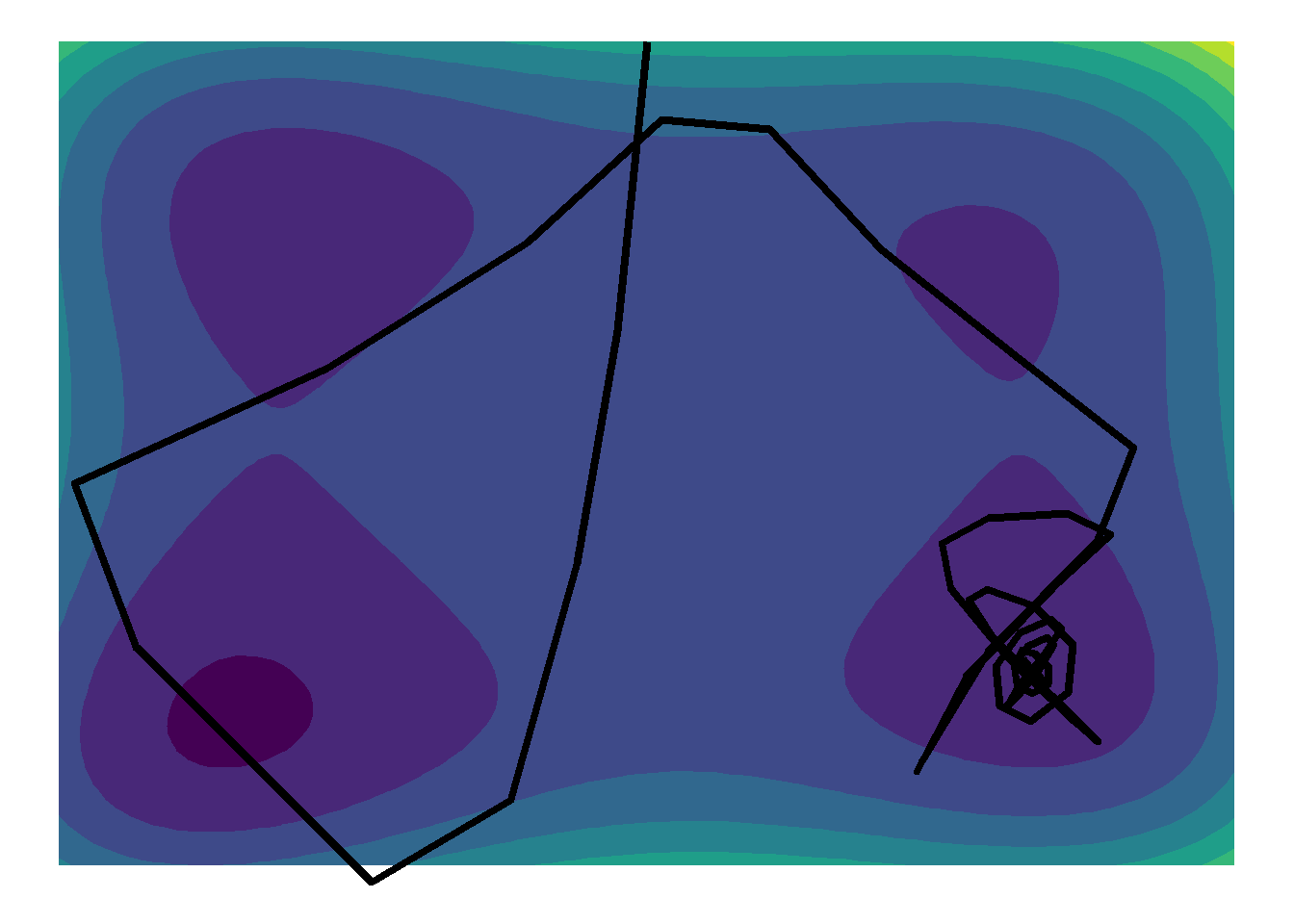 Pela Figura acima, nota-se que adicionando o componente de momento ao algoritmo de gradiente descendente, os passos da função de tornam muito mais erráticos, permitindo que a função passeie pelo espaço paramétrico por mais tempo, e impedindo o gradiente de descer nos primeiros vales que percorre. É possível observar que a função passou por todos os quatro vales de mínimos, até convergir em um dos mínimos locais.